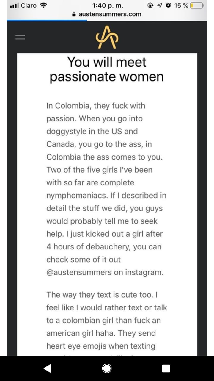 As these organizations started to research on this report, they found out that Summer’s web page and social media were also plagued with plenty of racist and misogynist content, labeling Colombian women as “submissive” and “sweet” who “fuck with passion.” Moreover, he promotes his academy as a way to “have more choice in who you sleep with and date, and get a high-quality girlfriend or multiple fuckbuddies”.
