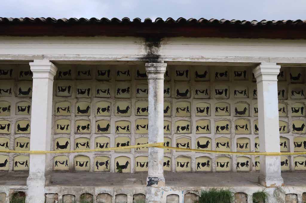 The Centro de Memoria, Paz y Reconciliación which holds the Auras Anónimas (Anonymous Auras) is on the busy Avenida El Dorado. But upon stepping through the gates, the sound of engines and beeping horns seems to fade away, and one is enveloped in an eerie quiet. Beatriz González’ figures – etched onto stylised rows of the columbariums that Catholics use to house cremation urns – stretch away towards the cemetery, whilst the huge block of stone that is the Centro itself towers upwards into the sky. It feels something of a wasteland, empty apart from the occasional strolling visitor and a solitary black cat. She prowls along the columbariums, staking her territory beyond the yellow tape which I, with my camera, am strictly instructed not to cross.